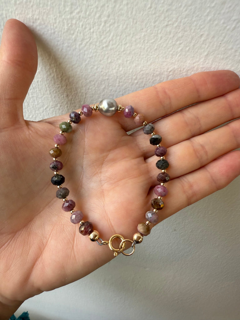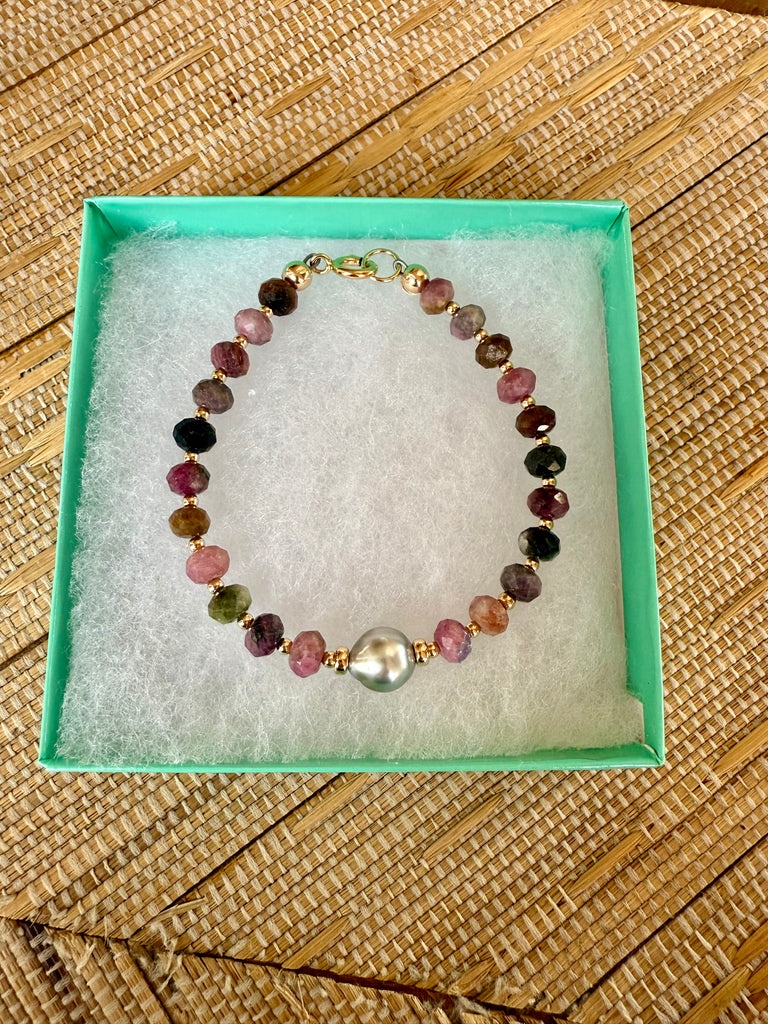 Watermelon Tourmaline • Tahitian Pearl • 14KT Goldfilled beads/clasp. 7 1/2 inches.